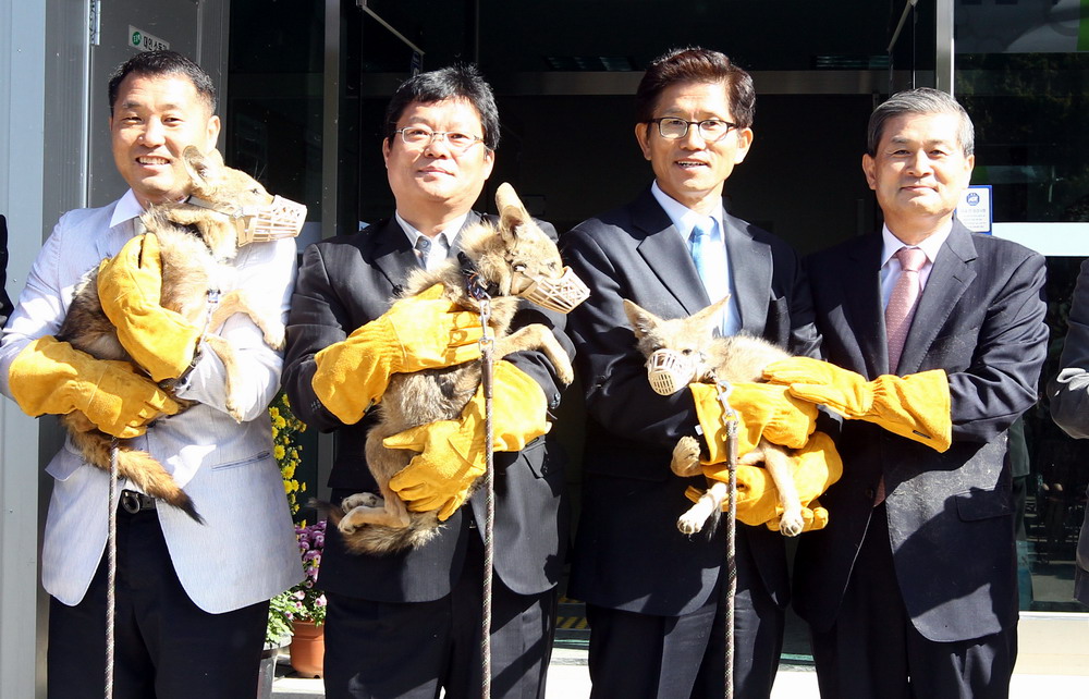 10月17日,在韓國京畿道野生動(dòng)物救助中心,韓國科學(xué)家黃禹錫(右一)將一只克隆郊狼送給京畿道知事金文洙(右二)。