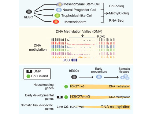 目前的研究將結(jié)束這一觀念。研究人員發(fā)現(xiàn),在分析整個基因組的這些修飾,即表觀遺傳組時,調(diào)節(jié)早期胚胎發(fā)育的主控基因往往由組蛋白甲基化H3K27me3關(guān)閉。同時,細胞分化的最后階段主要由DNA甲基化來精心安排,使細胞變得越來越專注于特定的功能。