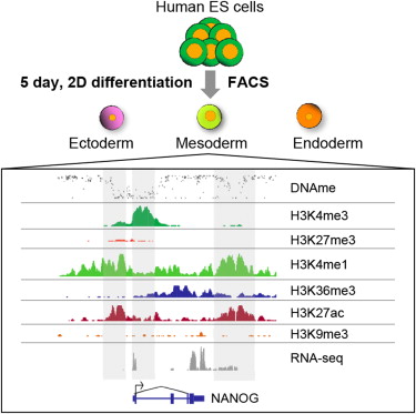 研究人員利用全基因組重亞硫酸鹽測(cè)序技術(shù),并結(jié)合染色質(zhì)免疫沉淀測(cè)序方法,以及RNA測(cè)序方法,揭示了與每個(gè)胚層細(xì)胞系特異性有關(guān)的中的特殊事件。在假設(shè)遠(yuǎn) 端調(diào)控元件中出現(xiàn)了一些顯而易見的DNA甲基化和H3K4me1譜系特異性變化,而這些元件均頻繁的與未分化人類胚胎干細(xì)胞中多能性因子結(jié)合在一起。