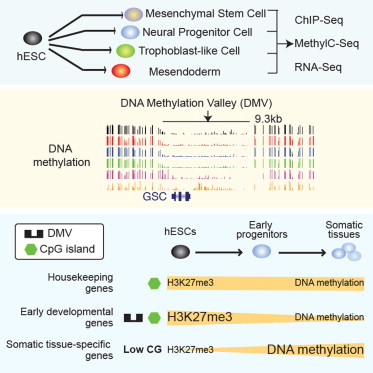研究人員發(fā)現(xiàn)在分析整個(gè)基因組的表觀遺傳組時(shí),調(diào)節(jié)早期胚胎發(fā)育的主控基因往往由組蛋白甲基化H3K27me3關(guān)閉。同時(shí),細(xì)胞分化的最后階段主要由DNA甲基化來精心安排,使細(xì)胞變得越來越專注于特定的功能。