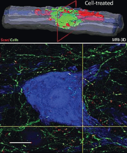 上圖:脊髓損傷造成的凹處被嫁接的神經(jīng)干細(xì)胞(圖中綠色區(qū))填滿